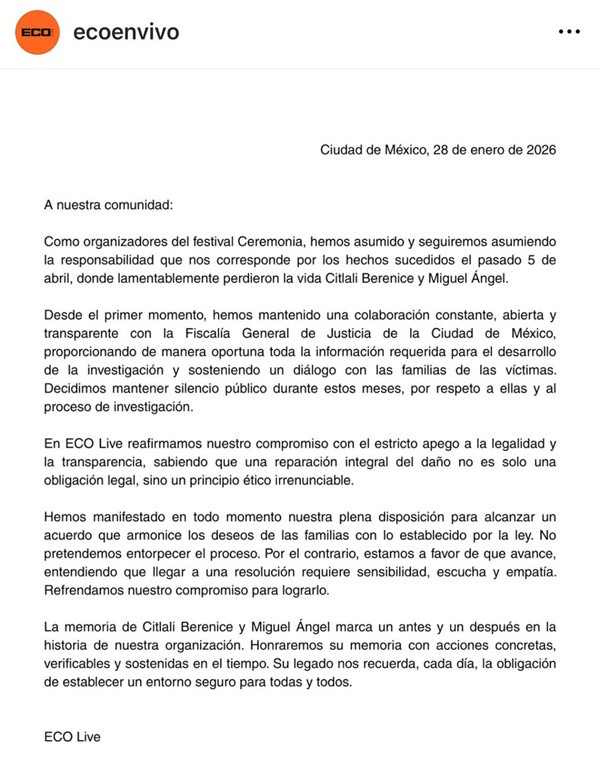 Finalmente, ECO Live reconoció que la muerte de Citlali Berenice y Miguel Ángel representa un punto de quiebre para la organización. Indicó que su memoria será honrada mediante acciones concretas y sostenidas para reforzar la seguridad en futuros eventos, con el compromiso de ofrecer entornos más seguros para el público y el personal involucrado.